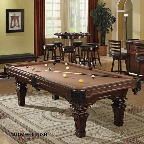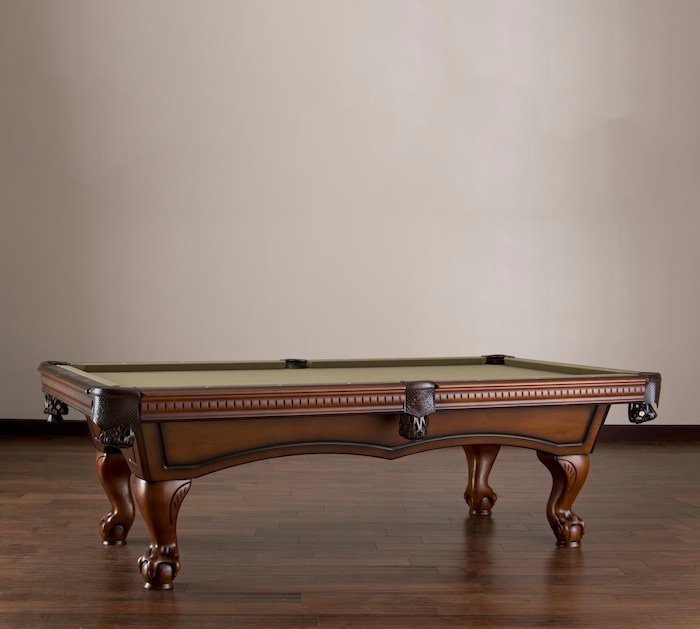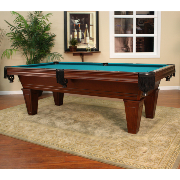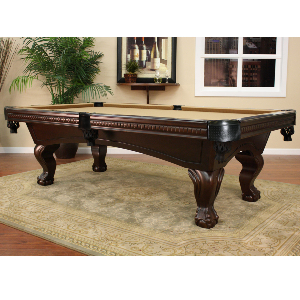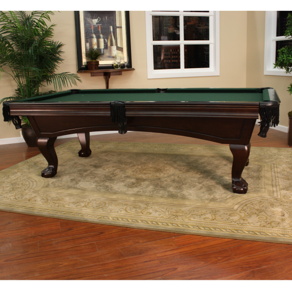 Lexington Pool Table in Mahogany Finish This is a richly stained Mahogany Pool Table with elegantly hand carved Ball and Claw Legs Cabinet and Hardware Artisan crafted from American Maple and select hardwoods with a rich Walnut finish. All interior connections are secured by wood hanger brackets with pre-threaded steel receivers recessed into the cabinet. The Deep Walnut finish is hand rubbed, sanded, sealed and a pre-catalyzed lacquer is applied for a deep, long lasting sheen and beauty. Available in 7' and 8' sizes Leg Style Hand carved, solid ball and claw legs attach to the cabinet with a unique solid steel bracket system. Steel brackets are fastened to the cabinet and legs with steel bolts and pre-threaded receivers are recessed into the cabinet. This system provides optimum strength and rigidity. Pockets and Slate Genuine leather pockets wrap around a die cast iron core for beauty and durability. Balls are held in this leather mesh pocket decorated with a shield. Allentown Tables always uses 3 piece, 1" backed slate. Diamond honed and perfectly matched to provide a consistent and absolutely level playing surface. Rails and Cushions A 2 piece t-nut fastening plate secures rails and aprons to the slate bed for precision fitting. Mother of Pearl precision inlaid diamond sites are a nice touch. BCA Approved K-66 profile cushions with natural gum rubber. BASIC ACCESSORY KIT INCLUDED.PLEASE VISIT OUR ACCESSORY PAGE FOR MORE ACCESSORY OPTIONS.