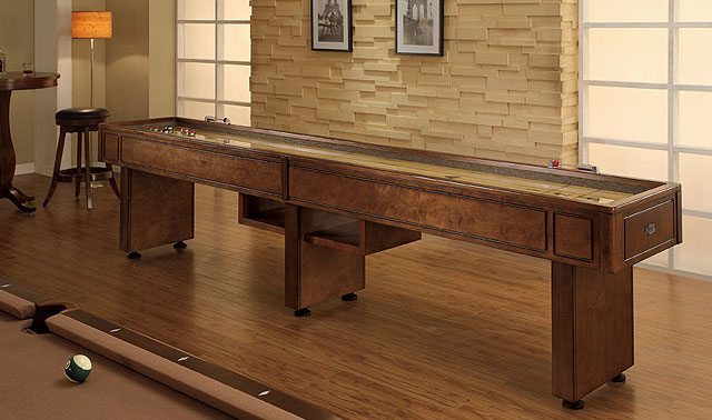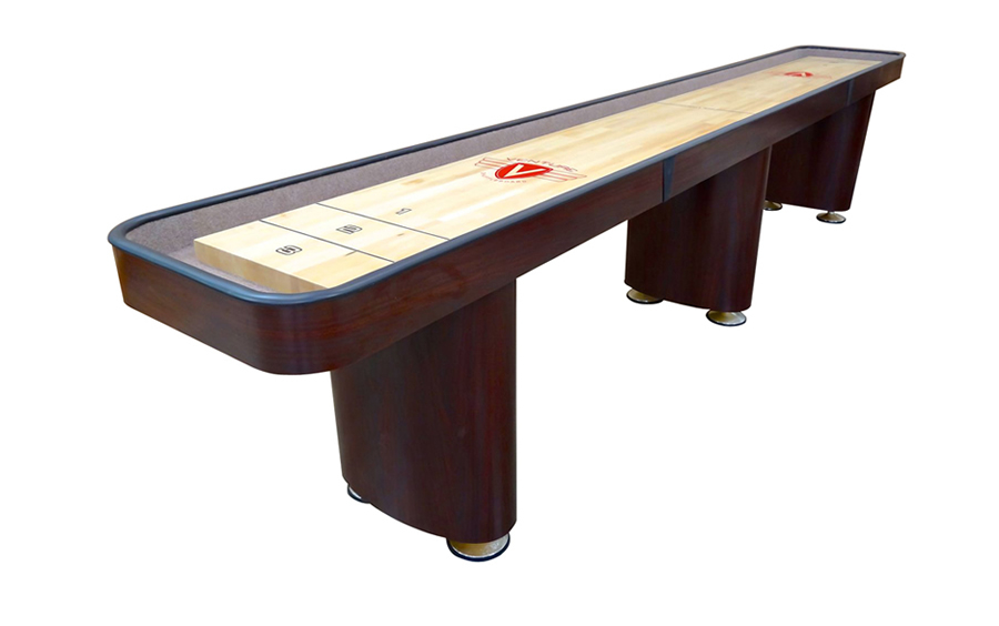 Venture's Challenger shuffleboard is built on a sturdy, uni-body frame with slightly scaled down dimensions from our largest tables. Constructed on a solid plywood base and finished using a high pressure laminate, the Challenger is sturdy and durable for any home setting and it's clean lines compliment any home's style. The Challenger is offered in 2 finishes: Fusion Maple and Empire Mahogany, both pictured above.