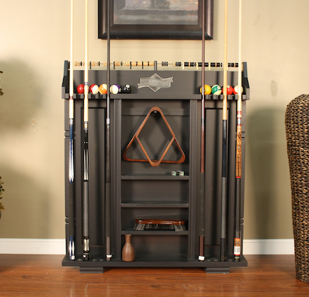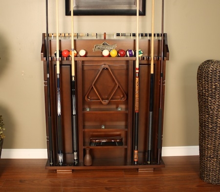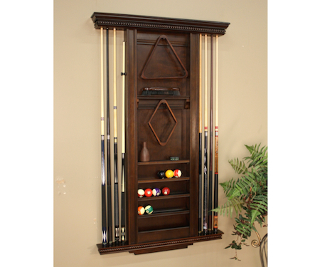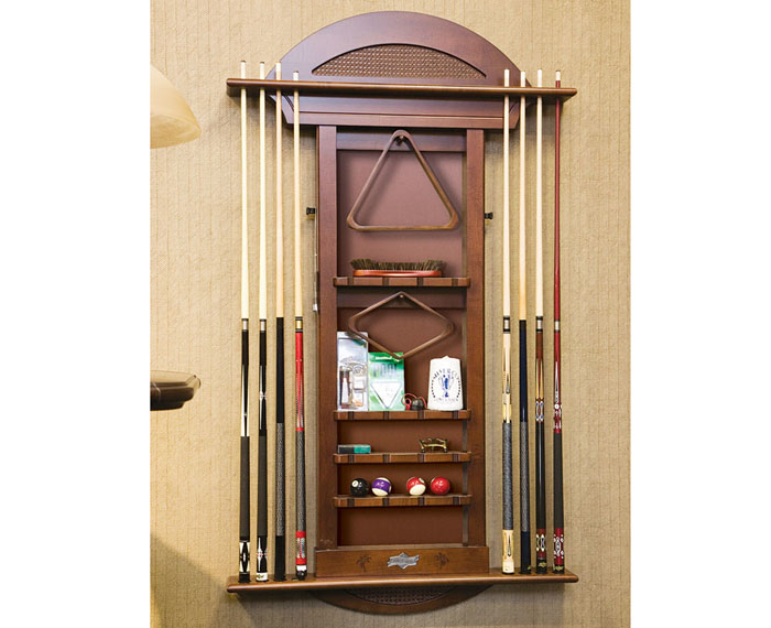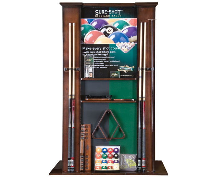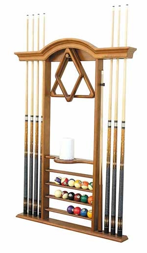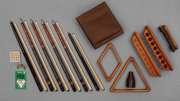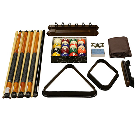 Matching finish to your Pool Table Matching Pinnacle hardwood 15-ball rack, 9-ball rack, and matching 10 1/2” hardwood horse hair brush. Matching hardwood wall mounted rack. Four Pinnacle 58” two-piece maple cues with Irish Linen wrap One Premium 48” two-piece maple cue with soft touch grip. Deluxe vinyl table cover Two-piece bridge cue with soft touch grip with brass bridge head. Leather shaker bottle, wooden tally balls and rule book Aramith Premier Balls