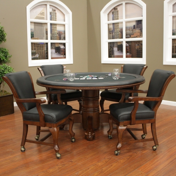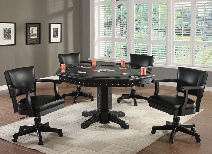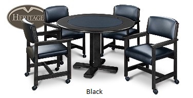 Classic Poker Table Game Set $2,399.00 Be ready for a game of cards with friends, a challenging board game with the family, or a nice dinner with someone special. This 48"" octagonal table includes a flip-top with one side having drink holders and chip trays and removable rubber inserts to protect from spills. The other side? A beautiful dining top! This innovative design is just one of the many ways Legacy surpasses the competition. The Classic game set comes with 4 matching chairs with black faux leather that swivel, tilt, and adjust in height. Available in Black Onyx,Oak,Black Cherry,Nutmeg and Port finishes
