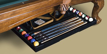Add a hidden storage drawer to most major brands of 7, 8 or 9-foot billiard tables with Legacy's patented Perfect Drawer. The Perfect Drawer stores all billiard accessories safely and indiscreetly under your billiard table. The Perfect Drawer mounts quickly and easily underneath any seven, eight or nine-foot billiard table without special tools or retrofitting. A slight pull on the Perfect Drawer glides the drawer out to reveal all your accessories. Inside, the protective felt liner cradles each cue, ball and rack in organized partitions.The Perfect Drawer fits most 9-foot tables with the converter kit. Center-beam billiard tables will need the center beam adapter kit.