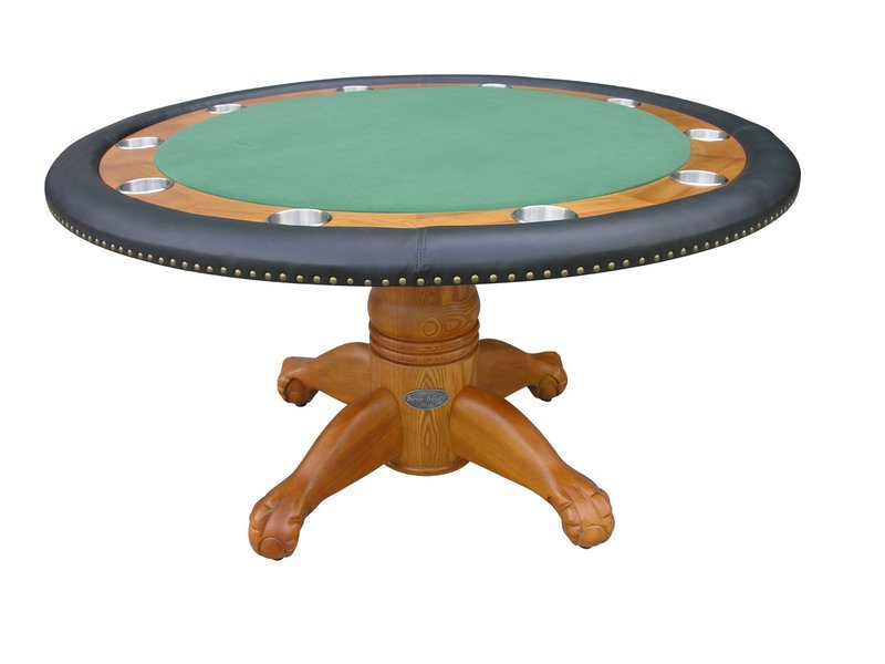 60" Poker Table with optional dining top (sold separately). Converts instantly from a 10 person poker table to a dining table. • 60" Round • Oak Finish • Top and base of selected hardwoods and veneers • Designer pedestal with solid wood ball & claw foot • Includes 2 removable foam cushioned felt poker tops in Green & Red • Padded black vinyl outer rail accentuated by brass accents / nail heads • Stainless steel drink holders • Assembly Required • 4 Oak Poker Chairs included Dimensions: 60"D x 32"H Weight: 175 pounds