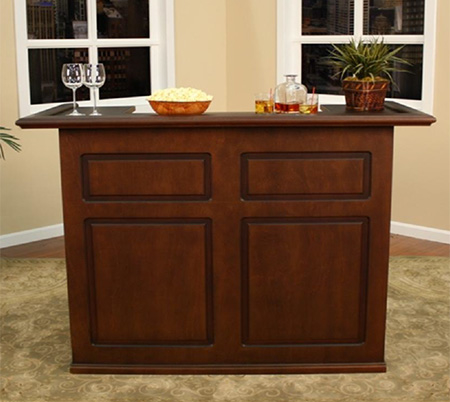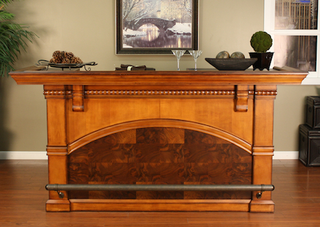 This 58" Trenton Bar is finished with a rich Suede Walnut finish and a decorative front panel.This Bar has plenty of storage shelving and a place for a fridge. Works great with Designer Bar stools
