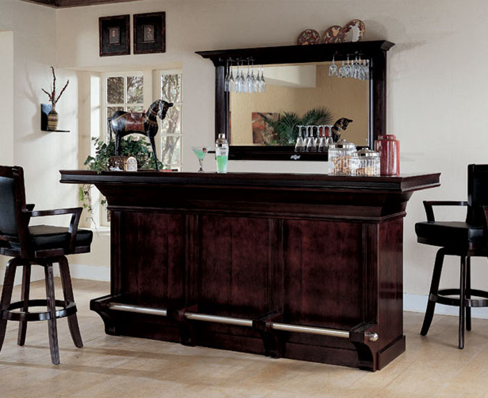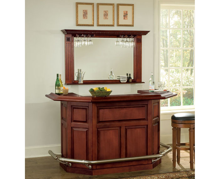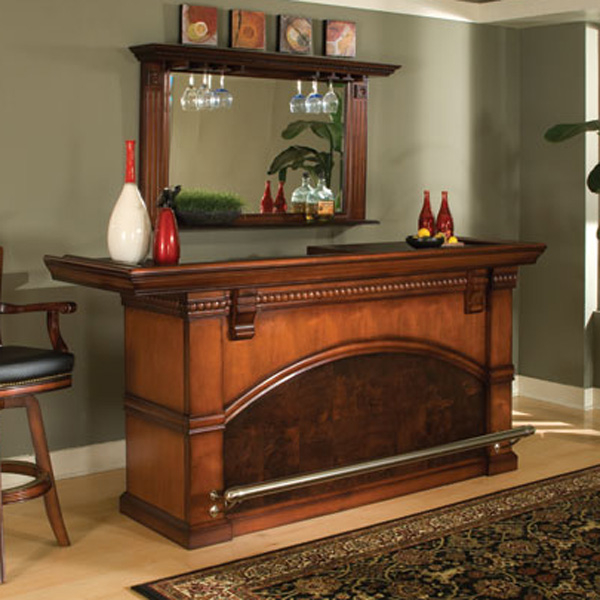 This Beautifully designed Bar package includes: 77" AUGUSTA BAR IN SUEDE STAIN 54" MATCHING MIRROR CABINET 2 MATCHING AUBURN BAR STOOLS