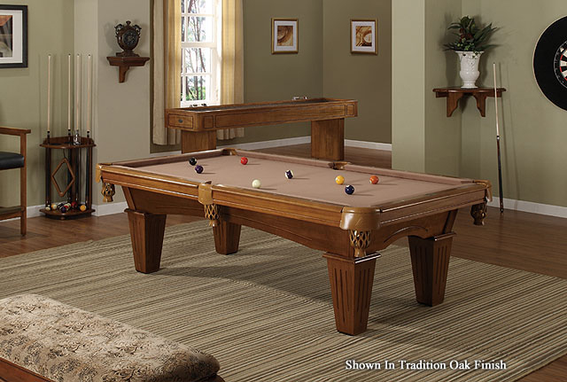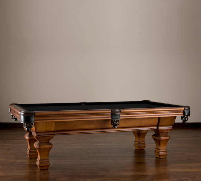 Cabinet and Hardware 1.25" thick solid wood cabinet. Fully routered, hardwood notched panel cabinetwork. Available in four finishes; Old English, Black Cherry, Nutmeg and Port. Available in 8' and 9' sizes Leg Style Hand carved, oversized fluted legs attach to the cabinet with a patented all wood corner construction. Pockets and Slate Genuine leather shielded pockets wrap around a die cast iron core for beauty and durability. Allentown Tables always uses 3 piece, 1" oversized slate. Diamond honed and perfectly matched to provide a consistent and absolutely level playing surface. Rails and Cushions Pro-style rails with hand inlaid mother of pearl sites.Rails are secured to the slate by Legacy’s Power Lock. An oversized t-nut fastener is securely held into the rail by a solid hardwood core to tightly hold the extreme torque of the rail bolts onto the table. K-66 profile cushions are natural gum rubber.
