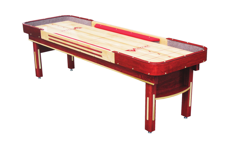 The 9’ Grand Deluxe Bankshot Shuffleboard Table uses three types of wood, maple, mahogany, and poplar, for authentic appearance and natural beauty. A 1 3/4" thick playing surface is comprised of 100 % kiln-dried hard rock maple, coated with Venture's exclusive hard clear synthetic lacquer. The 9" Grand Deluxe Cushion Shuffleboard Table includes all of the aesthetic features of the Grand Deluxe line and has been modified with cushions and a 24" wide playfield, creates another dimension to the game of shuffleboard. Perfect for the home that doesn't have the space for a traditional long board.
