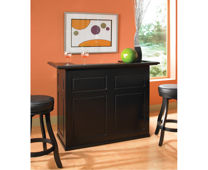 This 58" Trenton Bar is finished with a rich Black finish and a decorative front panel.This Bar has plenty of storage shelving and a place for a fridge. Works great with Designer Bar stools