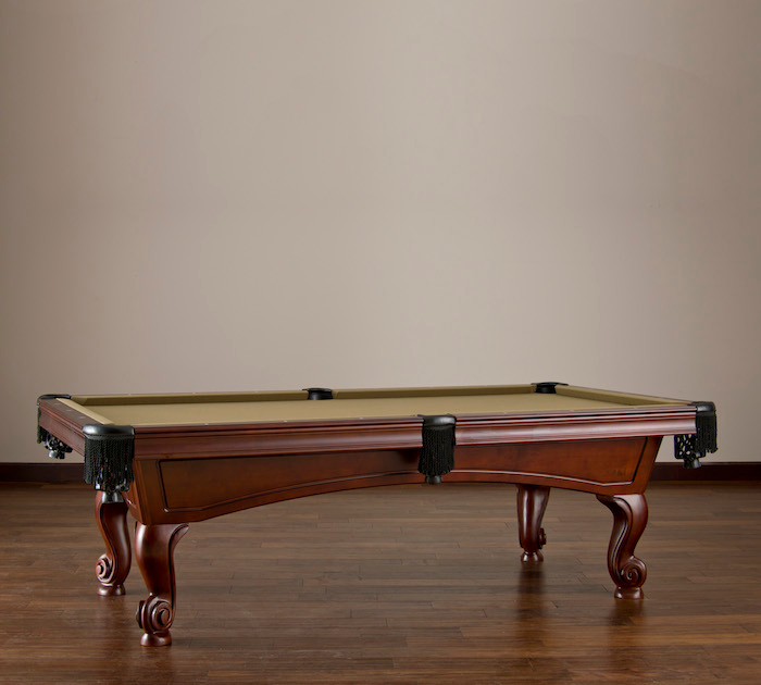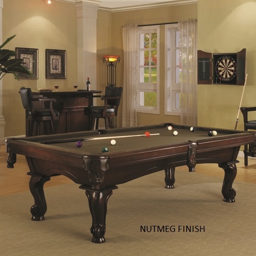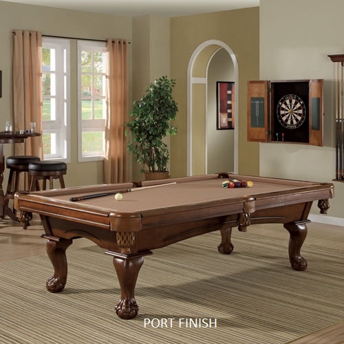 Legacy Rylee Pool Table Cabinet and Hardware 1.25" thick solid arched hardwood cabinet. Hardwoods are used in the cabinets,legs,top-rails,blinds and cross-beam slate support. Available in three finishes: Port, Black Cherry and Nutmeg. Available in 7' and 8' sizes Leg Style Hand carved, solid hardwood ball and claw legs attach to the cabinet with the patented Perfect Corner. This design guarantees each table assembly will be perfectly square. This design provides the strongest cabinet corner support of any billiard brand in the industry. Pockets and Slate Genuine leather shielded pockets wrap around a die cast iron core for beauty and durability. Balls are held in this leather mesh shield pocket. Allentown Tables always uses 3 piece, 1" backed slate. Diamond honed and perfectly matched to provide a consistent and absolutely level playing surface. Rails and Cushions A 2 piece t-nut fastening plate secures rails and aprons to the slate bed for precision fitting. Mother of Pearl precision inlaid diamond sites are a nice touch. BCA Approved K-66 profile cushions with natural gum rubber. Solid hardwood sub-rails are designed for optimal ball response.
