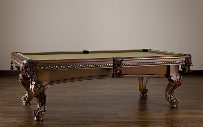 Cabinet and Hardware 1 1/4" thick wood cabinet. Quad beam frame construction designed to create a dead flat playing surface by unitizing the frame and cabinet and distributing the weight evenly throughout the table. The suede finish is hand rubbed, sanded, sealed and a pre-catalyzed lacquer is applied for a deep, long lasting sheen and beauty. Available in 8' and 9' sizes Leg Style Hand carved, solid hardwood legs with ram horn design attach to the cabinet with recessed mortise and tenon wood cabinet joinery. Pockets and Slate Genuine leather with Loop and Tassel pockets wrap around a die cast iron core for beauty and durability... Allentown Tables always uses 3 piece, 1" oversized slate. Diamond honed and perfectly matched to provide a consistent and absolutely level playing surface. Rails and Cushions! A 2 piece t-nut fastening plate secures rails and aprons to the slate bed for precision fitting. Mother of Pearl precision inlaid diamond sites are a nice touch. BCA Approved K-66 profile cushions with natural gum rubber. Solid hardwood sub-rails are designed for optimal ball response