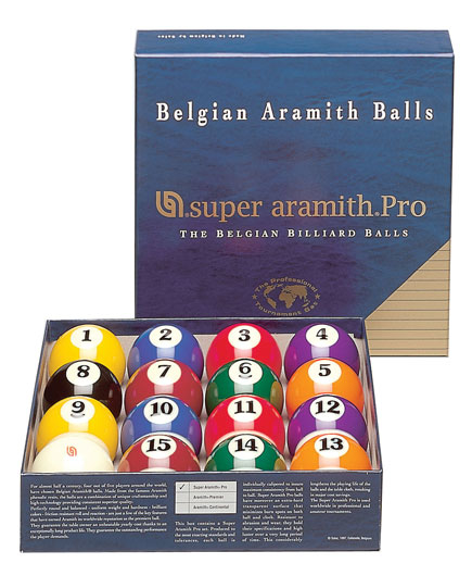 The top of the line Belgian Aramith balls. Aramith Super Pro billiard balls are the choice of pro tournaments worldwide. They are made of the highest grade Phenolic Resin which is far more durable than polyester. These billiard balls must meet 8 different quality control standards for denstiy, balance, diameter, roundness, color, gloss, hardness, and weight, measured to professional specifications