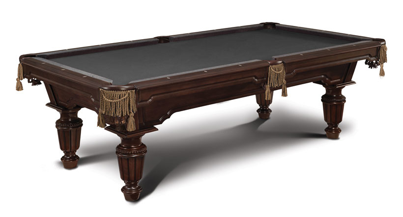 Cabinet and Hardware 1.25" thick solid wood cabinet.Featuring Legacy Billiards' patented Perfect Corner. Fully routered, hardwood notched panel cabinetwork. Available in four finishes; Old English, Black Cherry, Nutmeg and Port. Available in 8' Leg Style Hand carved, fluted legs attach to the cabinet with a patented all wood corner construction. Pockets and Slate Beautiful loop and tassel pockets wrap around a die cast iron core for beauty and durability. Allentown Tables always uses 3 piece, 1" backed slate. Diamond honed and perfectly matched to provide a consistent and absolutely level playing surface. Rails and Cushions Pro-style rails with hand inlaid mother of pearl sites.Rails are secured to the slate by Legacy’s Power Lock. An oversized t-nut fastener is securely held into the rail by a solid hardwood core to tightly hold the extreme torque of the rail bolts onto the table. K-66 profile cushions are natural gum rubber.