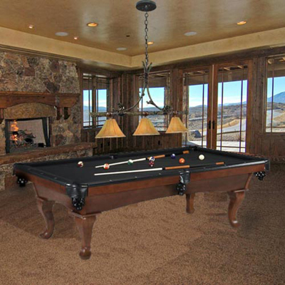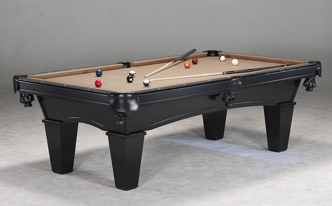 Cabinet and Hardware 1” Wood cabinet with Maple Veneer. This billiard table offers a unique, Southwestern look with its beautifully detailed design. Available in Onyx Finish. Available in 8' Leg Style Tapered legs attach to the cabinet with a unique solid steel bracket system. Steel brackets are fastened to the cabinet and legs with steel bolts and re-threaded receivers are recessed into the cabinet. This system provides optimum strength and rigidity. Pockets and Slate Durahyde Shield pockets wrap around a die cast iron core for beauty and durability. Allentown Tables always uses 3 piece, 1" backed slate. Diamond honed and perfectly matched to provide a consistent and absolutely level playing surface. Rails and Cushions Diamond mother of pearl sites. Fortress Power Rail (patent pending) with its 3/4" laminated T-nut securely attach the rails to the table
