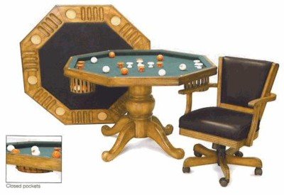 3 in 1 Combination Table: Converts instantly from a dining table to an 8 position poker table with the flip of the top. Remove the top to reveal the Bumper Pool option.Includes 4 Swivel Oak Poker Chairs with rolling casters. • 48" Octagon • Oak Finish • Dining Table • Poker Table • Bumper Pool Table • Poker side: 8 built in drink holders with 8 sections to hold your chips • Retractable leather pockets • Genuine Black Leather Poker top • Top and base of selected hardwoods and veneers • Solid wood foot pedestal • Includes accessories: Balls & Sticks • Assembly required for table and chairs Available in 54"