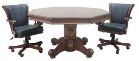 3 in 1 Combination Table: Converts instantly from a dining table to an 8 position poker table with the flip of the top. Remove the top to reveal the Bumper Pool option. • 54" Octagon • • Dark Antique Walnut Finish • • Dining Table • • Poker Table • • Bumper Pool Table • • Poker side: 8 built in drink holders with 8 sections to hold your chips • • Retractable pockets • • Black Leather Poker top • • Top and base of selected hardwoods and veneers • • Solid wood "rams horn" foot pedestal • • Includes accessories: Balls & Sticks • • Assembly required for table and chairs 4 Matching Chairs included in this price