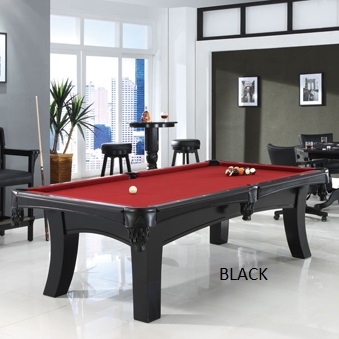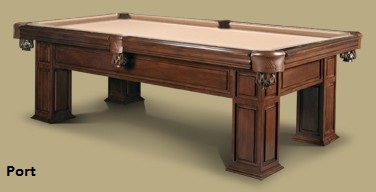 Cabinet and Hardware 1” Wood cabinet with Maple Veneer. Sturdy and durable in construction, the sleek and streamlined Stallion Pool Table keeps the focus on the purity of the game through it's understated design and excellent playability. It's affordable price makes it a top-level choice for a budget-minded game room design project..Available in Port Finish. Available in 8' Leg Style Spoon legs attach to the cabinet with a unique solid steel bracket system. Steel brackets are fastened to the cabinet and legs with steel bolts and re-threaded receivers are recessed into the cabinet. This system provides optimum strength and rigidity. Pockets and Slate Durahyde Shield pockets wrap around a die cast iron core for beauty and durability. Allentown Tables always uses 3 piece, 1" backed slate. Diamond honed and perfectly matched to provide a consistent and absolutely level playing surface. Rails and Cushions Diamond mother of pearl sites. Fortress Power Rail (patent pending) with its 3/4" laminated T-nut securely attach the rails to the table