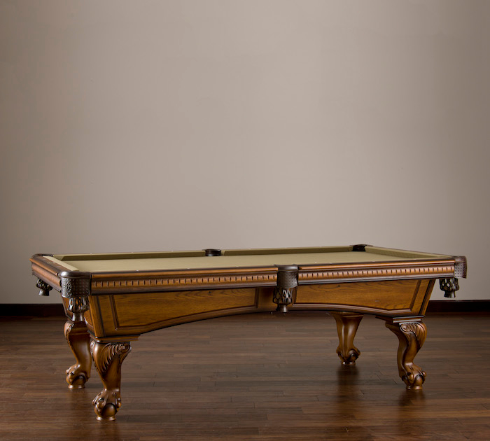 Cabinet and Hardware 1 1/4" thick wood cabinet. Quad beam frame construction designed to create a dead flat playing surface by unitizing the frame and cabinet and distributing the weight evenly throughout the table. The Vintage Oak finish is hand rubbed, sanded, sealed and a pre-catalyzed lacquer is applied for a deep, long lasting sheen and beauty. Available in 8' Leg Style These are massive ball and claw legs that give the table a very unique look. The legs are hand carved and attach to the cabinet via a unique mortise and tenon joint. This provides for uncompromising strength and rigidity. Pockets and Slate Genuine leather shielded pockets wrap around a die cast iron core for beauty and durability. Balls are held in this Leather shield pocket. Allentown Tables always uses 3 piece, 1" backed slate. Diamond honed and perfectly matched to provide a consistent and absolutely level playing surface. Rails and Cushions 6" wide-profile top rails are solid Wood! A 2 piece t-nut fastening plate secures rails and aprons to the slate bed for precision fitting. Mother of Pearl precision inlaid diamond sites are a nice touch. BCA Approved K-66 profile cushions are 100% natural gum rubber. Solid hardwood Sub-rails are designed for optimal ball response.