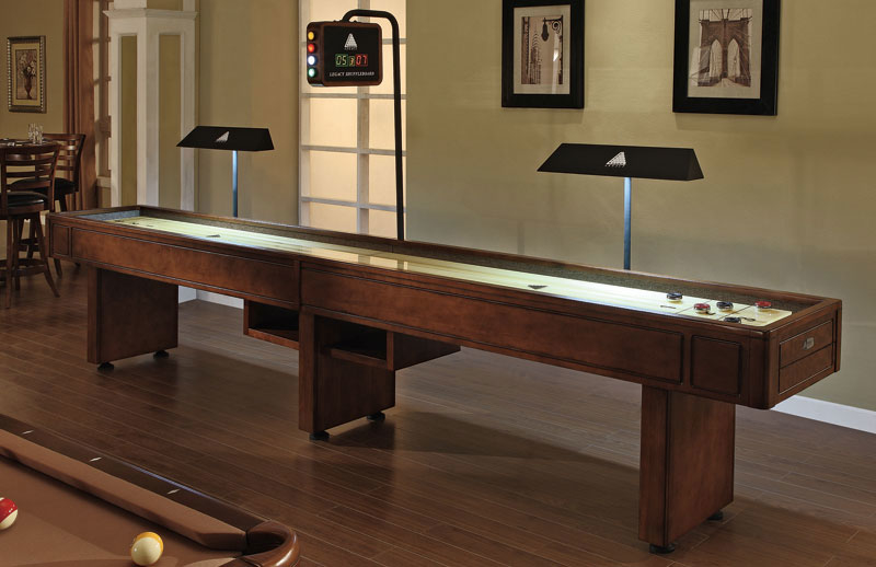Get ready for countless hours of fun and excitement with the Sterling 14 ft Shuffleboard. For storage of your pucks, brushes, and other accessories, the Sterling Shuffleboard table provides the Perfect Drawer, a glide in storage drawer mounted under the table. The shuffleboard playing field is 3 inches thick and is made with North American plantation grown yellow poplar. The 13 foot playfield boasts 4 scoring zones for even more action. This shuffleboard blows away the competition in quality and durablity and is backed with Legacy's lifetime warranty. Legacy recommends purchasing the optional light kit for 2 overhead lights and the score unit. Sterling Shuffleboard is pre-wired to add both.