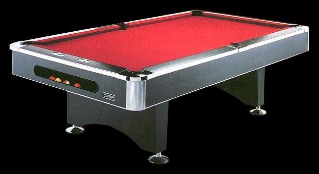 ALLOY BALL RETURN OPTION Cabinet and Hardware Black melamine with chrome accents finish this table nicely. Full length steel center beams run the table with 4 cross beams to carry the weight of the 1" slate. 4 player score keeper. Available in 8' and 9' sizes Leg Style Built in levelers make installation simple and accurate. Steel brackets are bolted to the slate bed, increasing strength and rigidity. Pockets and Slate Chrome corner accents decorate the vinyl pockets. This table has an optional alloy ball return system. The ball box is prefect for storage. This table uses 3 piece,1" slate for the 8' 9' table. Diamond honed and perfectly matched to provide a consistent and absolutely level playing surface. 1" Brazilian slate Sturdy melamine cabinet Chrome finish leg levelers High pressure laminate rails Chrome cabinet accents Laminated cross beams Alloy rail ball return system Available in 8 or 9 foot sizes